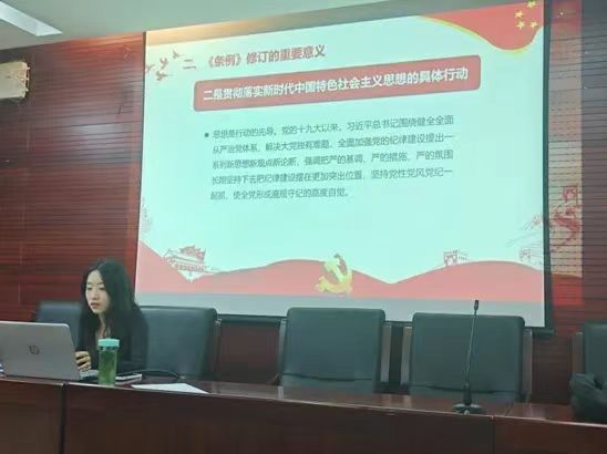 接着,支部书记潘倩围绕《条例》修订的背景和过程、重要意义、主旨要义、主要内容和如何贯彻执行《条例》五部分内容展开介绍,并对新增的重点条文逐一进行了解读。潘倩指出,各研究生、博士生党员应该把《条例》作为必修教材,学习党的纪律,只有坚持原原本本学、逐章逐条学、前后对比学,才能做到原汁原味悟,要知其言更知其义、知其然更知其所以然,进而不断增强强化遵规守纪的内在主动和行动自觉。不断增强政治定力、纪律定力、道德定力、抵腐定力。进一步筑牢思想根基、校正言行举止、强化自我锤炼,切实将学习成效转化为祖国建设、民族复兴贡献力量的强大动力。
